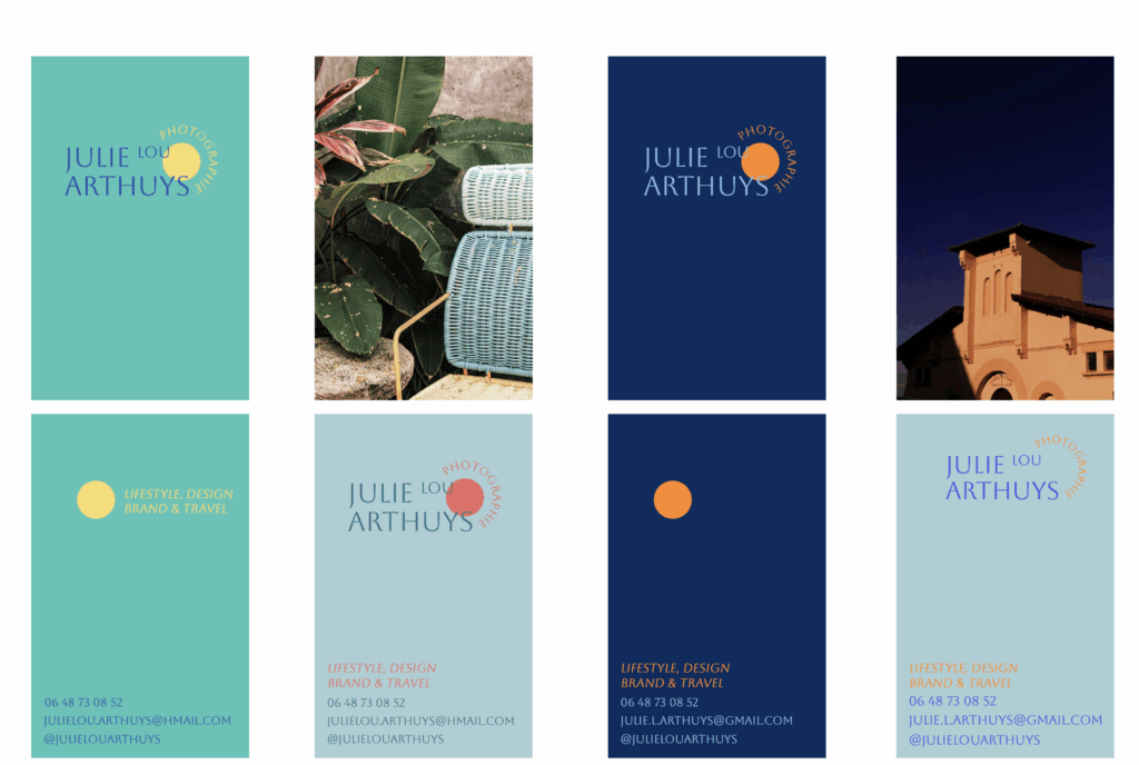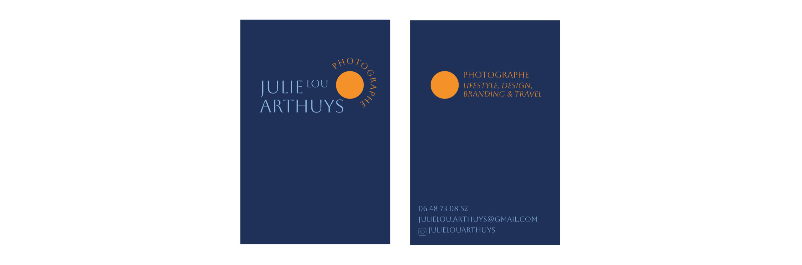La photographe Julie Lou Arthuys m’a contactée pour créer son identité visuelle, qui comprend un logo, des choix typographiques et des choix chromatiques. Cela nous a permis de créer une carte de visite ainsi que l’identité de son site internet. C’était très inspirant de partir de son travail déjà très visuel et de trouver la justesse dans mes choix graphiques
