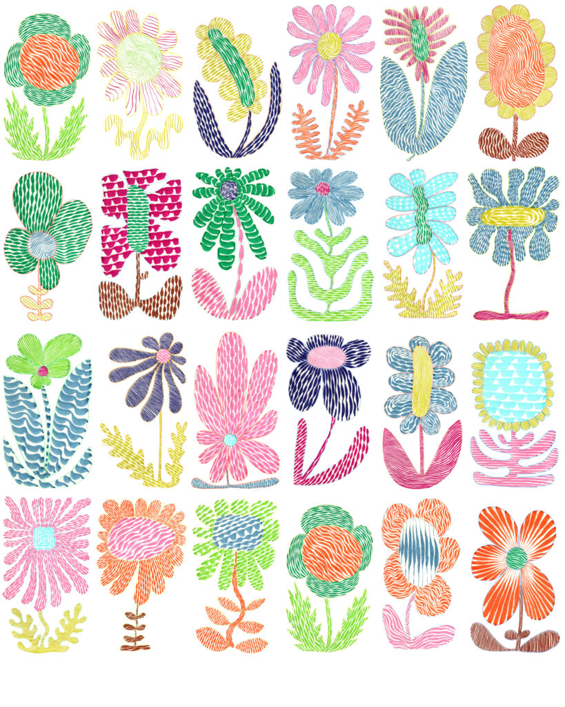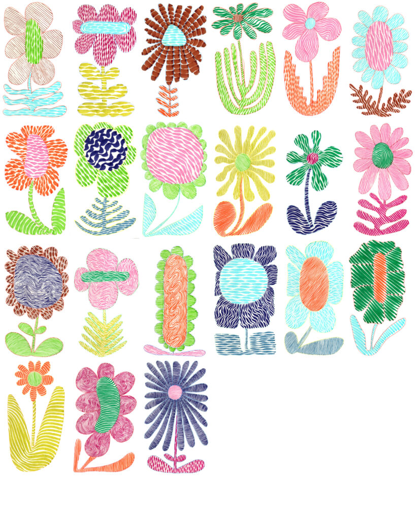 Objectif : créer un imprimé avec une série de 68 fleurs dessinées à la main
